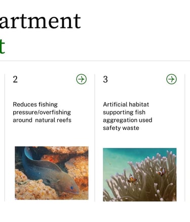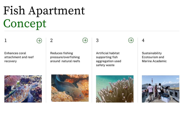 We design and develop artificial reef dive sites for resorts and ecotourism areas, combining fish apartments and coral restoration to create vibrant underwater attractions while supporting marine ecosystem recovery. The program also includes training for indigenous and local communities to participate in reef restoration, monitoring, and sustainable marine tourism.