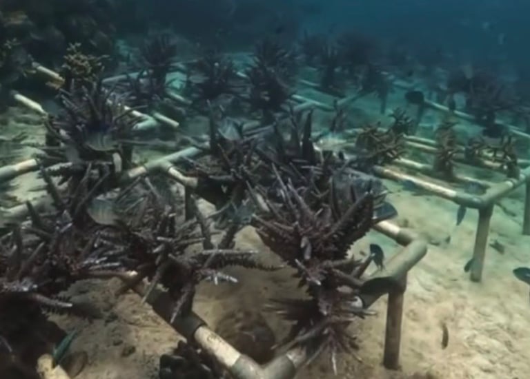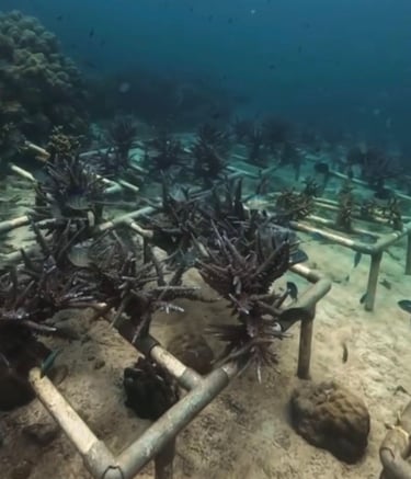 Artificial reef structures made from FABA (Fly Ash Bottom Ash) of coal burning waste/residue and coconut husk are used to create safe habitats for fish and marine life. Coral fragments are then transplanted and grown on these structures to help restore damaged reef ecosystems and rebuild marine biodiversity.